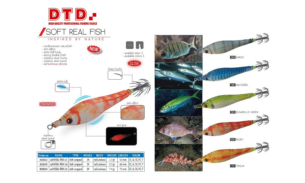 Οι νέες καλαμαρίερες της DTD διαθέτουν χρώματα παρόμοια με εκείνα φυσικών ψαριών της Μεσογείου, προσθέτοντας κόκκινο φώσφορο στην κοιλιά τους, η κόκκινη λάμψη για πολλούς ψαράδες θεωρείται ιδανική όταν υπάρχει πανσέληνος!!!