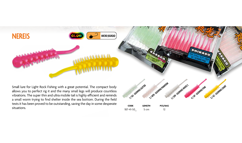 Μικρό τεχνητό για LRF(Light Rock Fishing) με μεγάλες δυνατότητες. Το συμπαγές σώμα του σας επιτρέπει σας επιτρέπει να το αρματώσετε τέλεια και τα πολλά μικρά πόδια θα παράγουν αμέτρητες δονήσεις. Η εξαιρετικά λεπτή και κινητική ουρά είναι άκρως αποτελεσματική και θυμίζει ένα μικρό σκουλήκι που προσπαθεί να βρει καταφύγιο στον βυθό της θάλασσας. Κατά τη διάρκεια των δοκιμών έχεθ αποδειχθεί ότι είναι εξαιρετικό σώζοντας την ημέρα σε κάποιες απελπισμένες καταστάσεις.