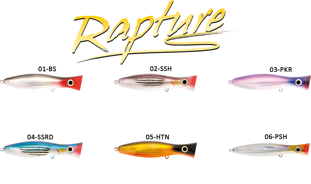 Trevally: Για τους θαυμαστές απλά "GT", για τα ψάρια ένας πραγματικός εφιάλτης!!!Μάλιστα τα συγκεκριμένα τεχνητά διαθέτουν ένα χαλύβδινο σύρμα που διατρέχει το σώμα και συνδέει όλους τους κρίκους, διασφαλίζοντας ότι ακόμα και η πιο βάναυση επίθεση δε θα τα καταστρέψει. Για αυτούς που ψαρεύουν στη Μεσόγειο υπάρχουν αμέτρητες ευκαιρίες για διασκέδαση με το Raiden Pop GT αφού οι Παλαμίδες και οι Τόνοι απρόβλεπτου μεγέθους τα ακολουθούν με υπερηχητική ταχύτητα, εξαπολύοντας την οργή τους με τρεξίματα εξίσου δυνατά. Ο οβάλ σχεδιασμός του κοίλου του προσώπου έχει σκοπό να ανυψώσει ένα βουνό από νερό, στέλνοντας ένα σαφές μήνυμα στους θηρευτές: τα φωτεινά χρώματα θα κάνουν τα υπόλοιπα. Συνιστώνται ανεπιφύλακτα επαρκή καλάμια που πρέπει να επιλέγονται εντός της σειράς Rapture Giant Run, ικανά να πετάξουν αυτά τα βαριά τεχνητά και να διαχειριστούν τη μάχη με τα ψάρια με την απαραίτητη δύναμη.